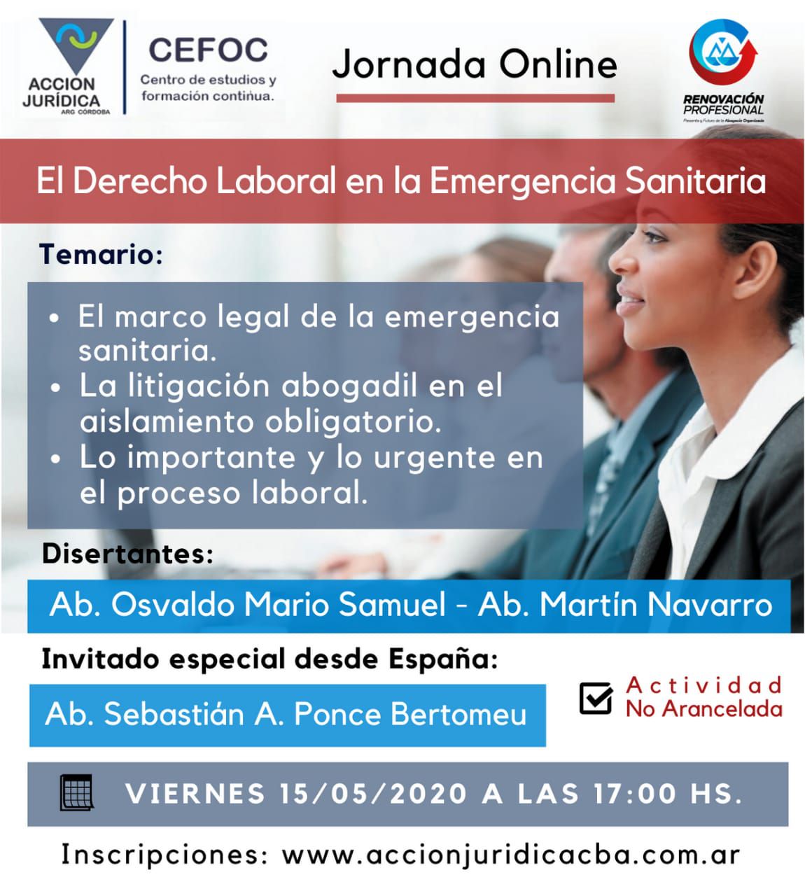 El Centro de estudios y formación continua CEFOC, desde ACCIÓN JURÍDICA ARG. CÓRDOBA y Renovación Profesional, te invitan a participar de la Jornada Online: El Derecho Laboral en la Emergencia Sanitaria, en el marco de la DIPLOMATURA: LAS CLAVES DEL PROCESO LABORAL EN LA PROVINCIA DE CÓRDOBA, a iniciar el próximo mes de Julio.